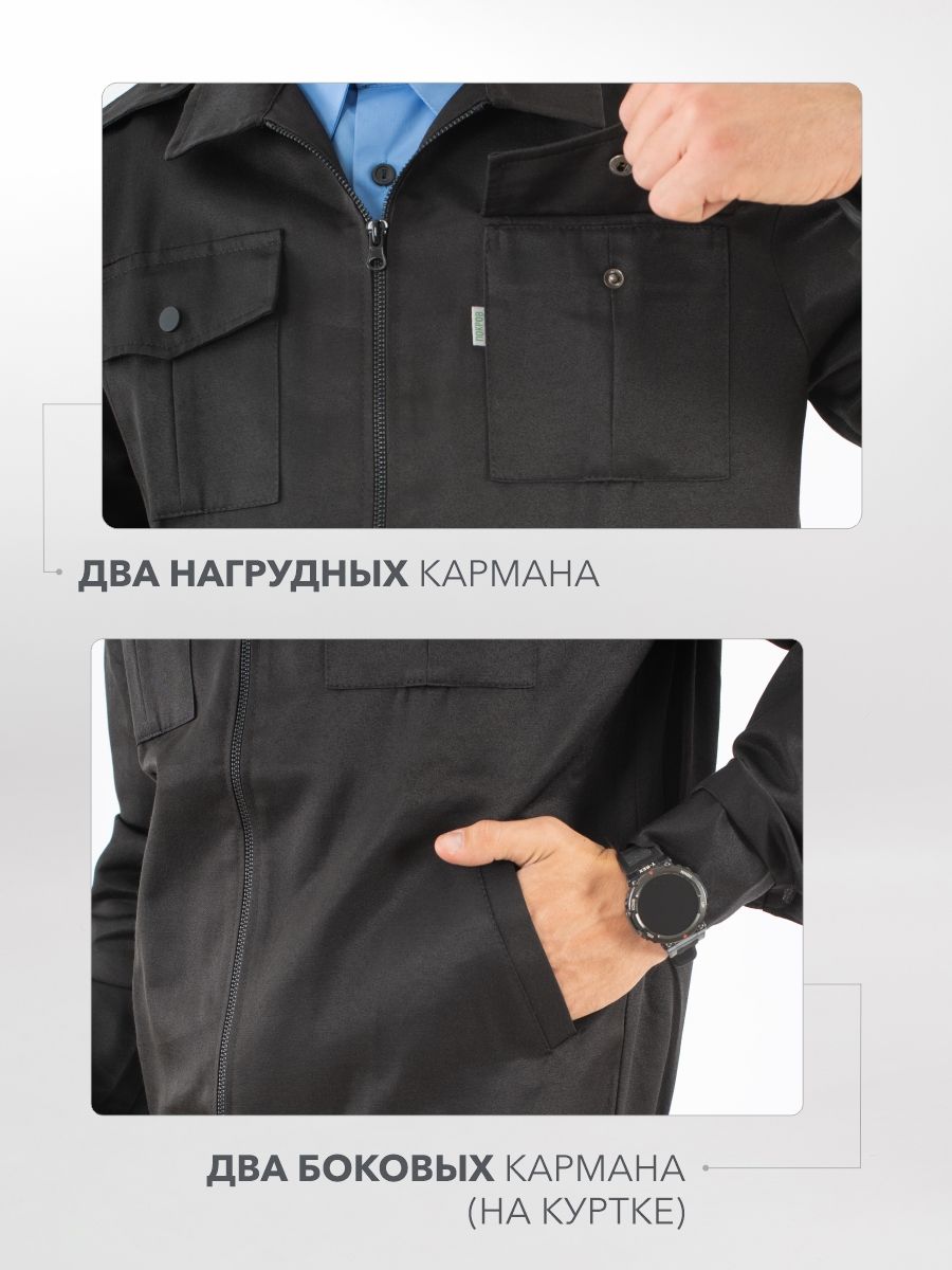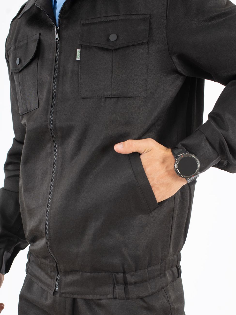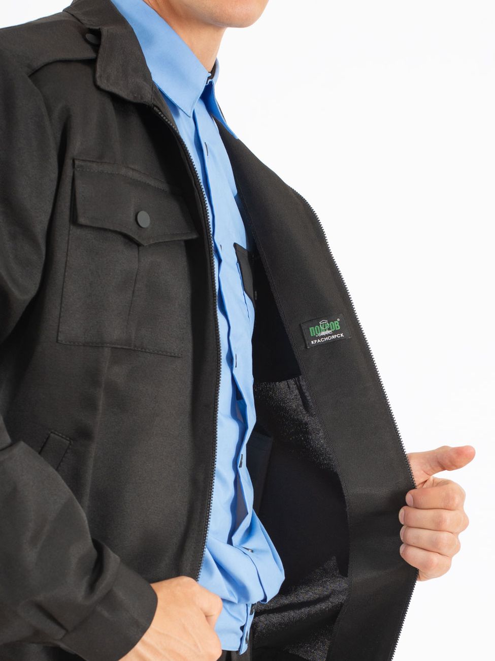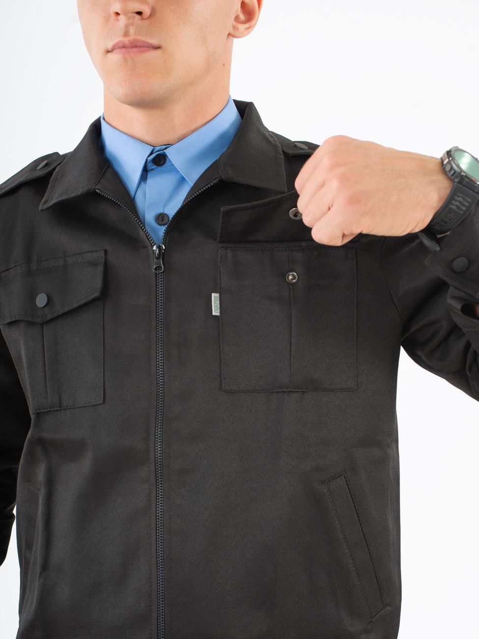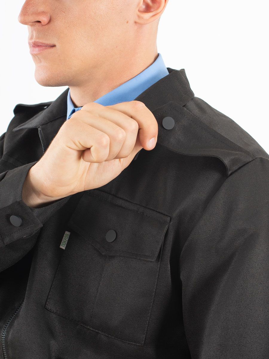 Центральная застёжка на «молнию». На полочках четыре кармана: два нижних, два нагрудных с клапанами на кнопки.