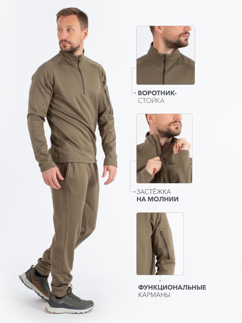 Мужской костюм из тонкого влагоотводящего флиса создан для максимального комфорта в любых условиях. Благодаря универсальному дизайну его можно использовать, как утепляющий слой в зимний период, так и базовый в прохладную погоду летом и в межсезонье.