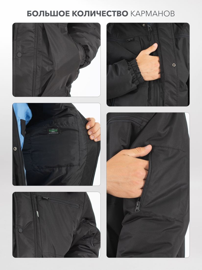 Карманы: шесть на полочках, в том числе на «молнии», один вертикальный на «молнии» на левом рукаве, два внутренних под документы, один скрытый, с легким доступом под пистолет.