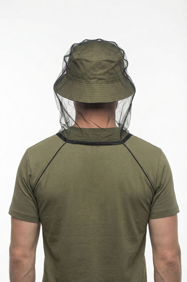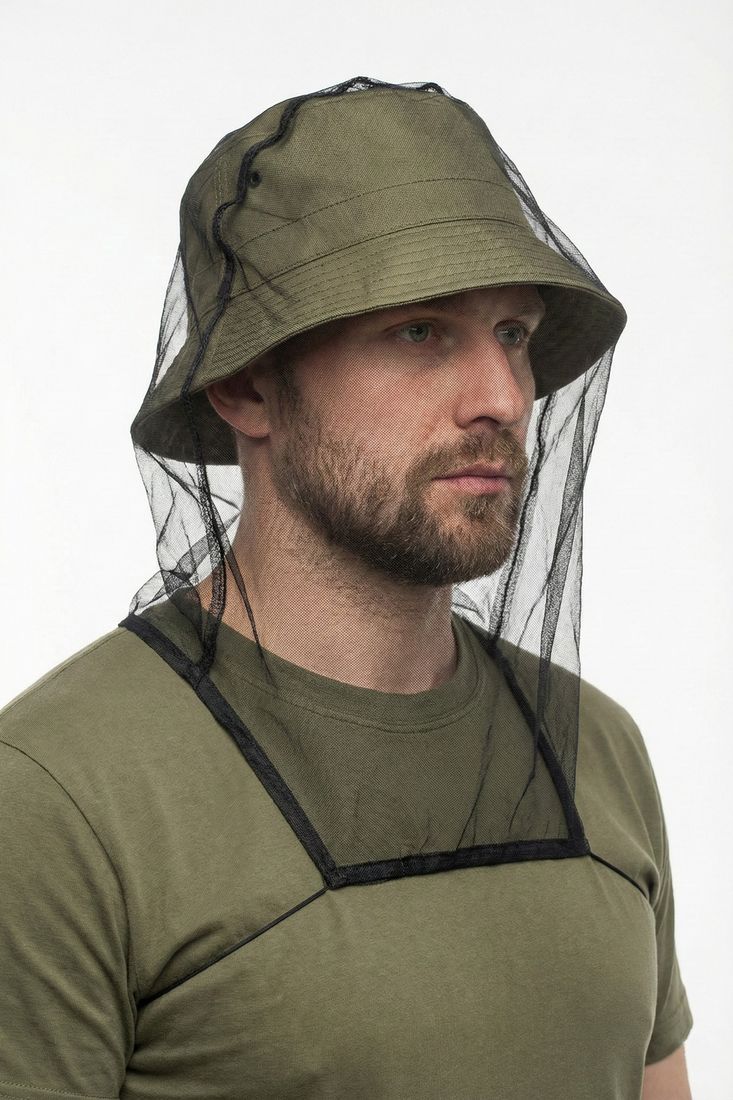 Накомарник надевается на голову и фиксируется в области проймы с помощью эластичного шнура.