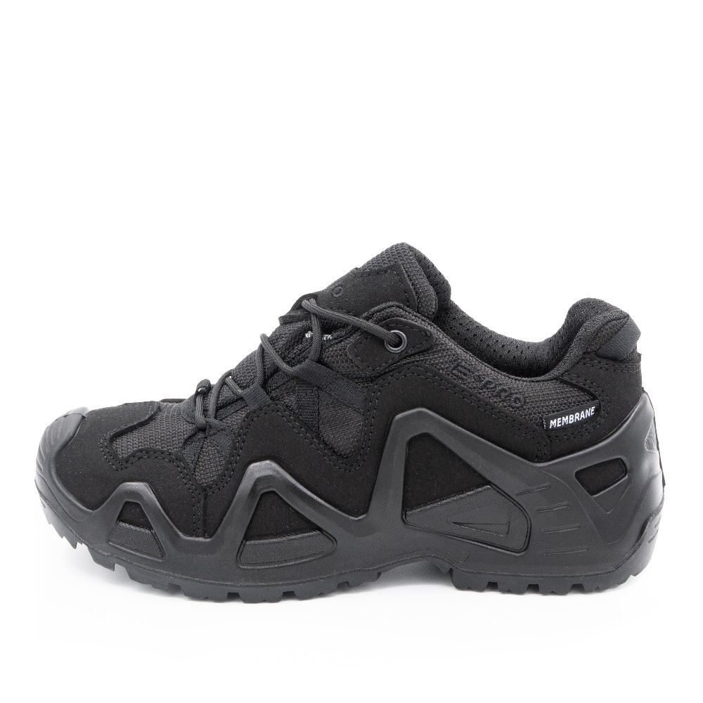 Серия обуви E-PRO — это одна из самых популярных в туристической и тактической обуви, используемая походниками, альпинистами, спортсменами, военными и сотрудниками правоохранительных органов. Основной материал изготовления — высококачественная замша со вставками из кордуры. Наличие подкладки из мембраны делает обувь непромокаемой и одновременно дышащей, способной отводить испарения с поверхности стопы. Подлитой носок обеспечивает защиту от повреждений. Защитный рант с выборками для облегчения веса проходит по всему периметру и создает узнаваемый образ. Кроме основных функций, рант дает дополнительное сцепление с поверхностью, например, при движении вдоль склона. Высота среднего ботинка 14.5 см, этого хватает для отличной фиксации голеностопа. Все детали прошиты двойным швом, все швы сделаны крайне аккуратно. На пятке есть петелька, облегчающая надевание. Подошва имеет многослойную структуру. Промежуточный слой из полиуретана придает высокие амортизирующие свойства; ходовой слой из резины на основе натурального каучука делает подошву более износостойкой и способствует хорошему сцеплению с грунтом и другими плоскостями.